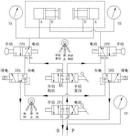 手動制動:電磁閥在失電的狀態(tài)下,方可轉(zhuǎn)為手動操作。至手拉閥SFA、SFB、轉(zhuǎn)閥ZF1于手動狀態(tài),當(dāng)滿足機組停機條件時,轉(zhuǎn)閥ZF2轉(zhuǎn)到手動制動狀態(tài),使氣體進(jìn)入制動腔,制動器動作加速機組停機。