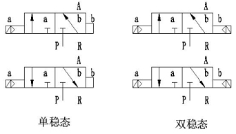 閥體兩端各有一個(gè)控制腔,兩個(gè)控制腔各有一個(gè)Φ2mm的先導(dǎo)孔與氣源壓力口(接口“P” )相通,氣源氣由先導(dǎo)閥來(lái)控制進(jìn)入控制腔(接口“A” )。當(dāng)一端線圈通電,磁力作用打開(kāi)先導(dǎo)閥,氣源氣進(jìn)入該端控制腔(接口“A” ),推動(dòng)活塞帶動(dòng)閥芯,改變工作狀態(tài)。閥體有單穩(wěn)態(tài)和雙穩(wěn)態(tài)兩種,單穩(wěn)態(tài)閥線圈只有長(zhǎng)期通電,電磁閥才能保持狀態(tài),一旦掉電,馬上復(fù)位。雙穩(wěn)態(tài)閥一旦線圈通電,閥位狀態(tài)改變后,即使掉電,仍保持現(xiàn)狀不變,只有當(dāng)一端線圈通電時(shí),閥位才會(huì)發(fā)生變化。