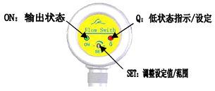 3、待流速穩(wěn)定后,調節(jié)“SET”螺絲,使流量開關從Q狀態(tài)(紅燈亮)剛好轉入ON狀態(tài)(綠燈亮)。